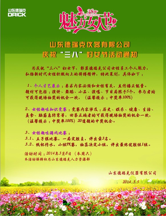 我國于194912月規定每年的38日婦女節,迄今為止已有60多年的歷史,而今年恰逢是三八婦女節第65周年。為了活躍企業文化氛圍,表彰和感謝女同胞們為公司做出的貢獻,山東德瑞克儀器有限公司決定于38日為所有女員工準備了一系列別開生面的歡慶活動,在表彰和感恩的同時也為德瑞克女同胞們展示個人才藝,彰顯女性風采提供了一個良好的舞臺。活動具體內容如下: